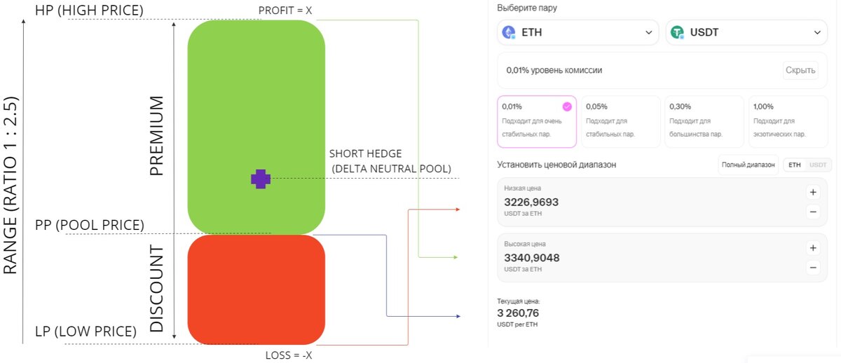 Двусторонний (содержащий два актива) пул ликвидности всегда имеет верхнуюю и нижнюю границу диапазона. На схеме это High price (HP) и Low price (LP). Это те уровни стоимости базового актива, на которых пул будет полностью состоять из одного актива и перестанет приносить комиссионную прибыль. В пуле ETH/USDT на верхней границе диапазона пул будет состоять полностью из USDT, в нижней границе баланс пула будет полностью из ETH.