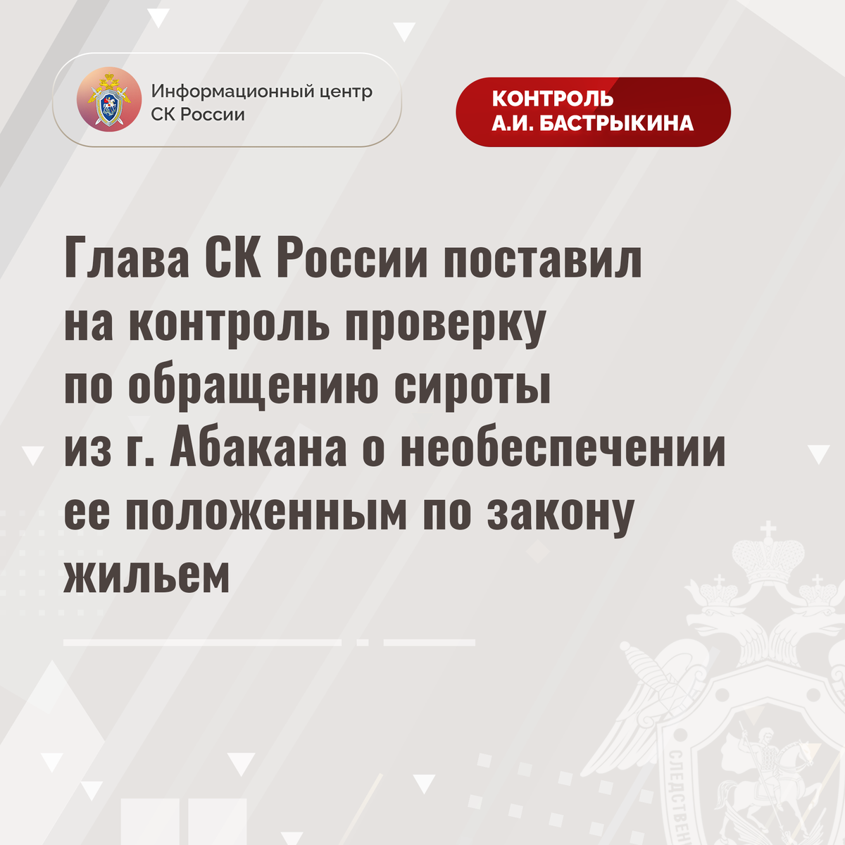 В Приёмную Председателя СК России А.И. Бастрыкина «ВКонтакте» обратилась 27-летняя сирота из города Абакана Республики Хакасия по вопросу нарушения ее жилищных прав. Девушка длительное время состоит на учете лиц, нуждающихся в обеспечении жилыми помещениями, однако, несмотря на вынесенные в 2018 и 2020 годах судебные решения, до настоящего времени ее права не реализованы. Обратившаяся с двумя детьми вынуждена арендовать жилье за свой счет.