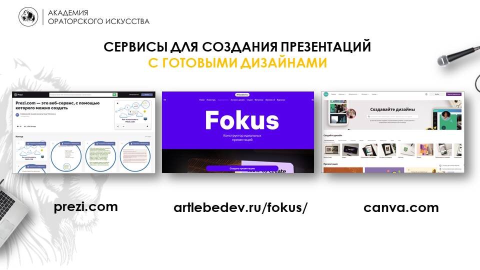 Сервисы для создания презентаций с готовыми дизайнами. Сервисы: - Фокус