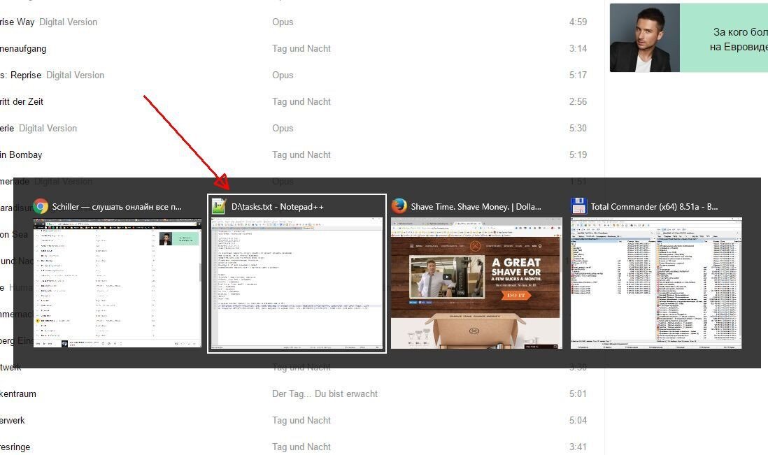 Добрый день, неутолимые исследователи! Сегодняшняя тема - как вернуть окно программы, которое "убежало" за пределы рабочего стола? У вас еще не случалось? А у меня случилось буквально на днях. Я использовал два монитора, все было отлично. Один монитор понадобился для другой задачи, и я его отключил. После начала работы я заметил, что мой любимый блокнот Notepad++ пропал из виду при запуске, хотя его активная иконка висела на панели задач. Но самого окна нигде не было! Что делать? Обнять монитор и плакать в иконку Notepad’а?:) Нет, есть решение! И сегодня мы поговорим о том, как вернуть окна обратно на рабочий стол. Первым делом, сделайте окно "убежавшей" программы активным. Выделите его мышкой на панели задач или переключитесь на него через Alt+Tab. На скриншоте приведен пример использования Alt+Tab. Теперь, когда окно программы активно, но самого окна не видно, внимательно прочитайте, что нужно сделать дальше. Нажмите комбинацию Alt+пробел. Это откроет специальное системное меню актив
