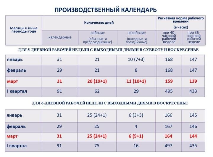 Эта дата в нашей стране признана официальным выходным. Таким образом, выходными днями являются: 8 (пятница), 9 (суббота), 10 марта (воскресенье)», — говорится в сообщении на сайте министерства. Также там рассказали, как будут отдыхать те, у кого шестидневная рабочая неделя с одним выходным в воскресенье. «В соответствии с производственным календарем, у белорусов в марте 2024 года при шестидневной рабочей неделе будет 24 рабочих дня и 1 предпраздничный — 7 марта, при пятидневной — 19 рабочих и 1 предпраздничный», — сказано в сообщении. То есть у тех, кто работает шесть дней в неделю, 8 марта должен быть выходной. В Минтруда добавили, что расчетная норма рабочего времени в марте при 40-часовой рабочей неделе составляет для пятидневной рабочей недели с выходными днями в субботу и воскресенье — 159 часов, а для шестидневной с выходным днем в воскресенье — 164 часа.