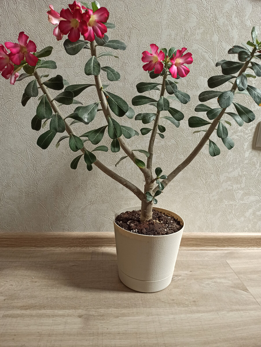 Адениум замечательный цветок, который сегодня приобретает большую популярность. Почему он так популярен и какие у него особенности узнаете в этом выпуске, дочитайте до конца! Еще его называют, Роза пустынь, из-за сходства цветков с цветками розы. Вырастает адениум до 35 см в высоту. В природе он произрастает в Южной и Цетральной Африке. У меня он появился 3 года назад. И вырос до внушительных размеров. Цветет он продолжительно и очень красиво: с апреля по июль и с сентября по октябрь. При подходящих для него условиях может цвести круглый год. Адемиумы бывают разных сортов и от этого зависит какого вида будет сам цветок: махровый, в виде розочки и т.п. Важно обратить на особенность адениума, он очень любит яркий солнечный свет. Поэтому самое лучшее окно для адемниума будет южным или западным. Но я его притеняю светоотражающей пленкой, как и все другие растения, чтоб листья у него не подгорели. Мне так спокойнее. Полив в летний период необходим после просыхания почвы, как увидели, что по