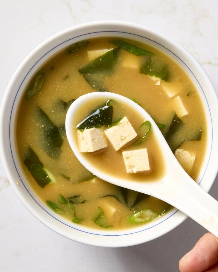 Суп мисо — идеальное пикантное начало любого приема пищи. ИНГРЕДИЕНТЫ • 2 чашки воды • 1 штука (5x5см) сушеного комбу • 1 чашка кацуобуси (сушеные хлопья тунца, 5 грамм) • 2 чайные ложки сушеных вакаме (водоросли, по желанию) • 1-2 зеленого лука • 100 грамм мягкого тофу • 2 столовые ложки белой или красной пасты мисо (белая имеет более мягкий вкус) ПРИГОТОВЛЕНИЕ Поместите 2 стакана воды и 1 кусок сушеного комбу (5х5 см) в небольшую кастрюлю. Поставьте на средний огонь (не нагревайте сильнее; вам нужно, чтобы вода нагревалась медленно). Прежде чем пузырьки начнут выходить со дна кастрюли, выключите огонь. Выньте комбу и оставьте для другого использования или выбросьте. Добавьте в кастрюлю 1 чашку кацуобуси. Верните бульон на огонь и варите 1 минуту. Выключите огонь и дайте кацуобуси настояться, пока готовите остальные ингредиенты. Если вы используете, поместите 2 чайные ложки сушеного вакаме в небольшую миску. Добавьте достаточно холодной воды, чтобы покрыть ее