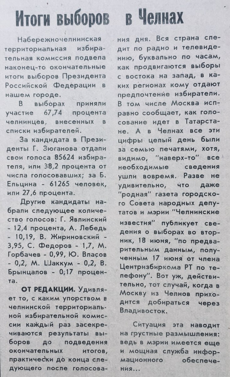 Впереди очередные выборы Президента Российской Федерации… Есть повод напомнить о результатах двух ранее проходивших выборов главы государства. Выборы 1996 года – это единственные в новейшей истории Российской Федерации президентские выборы, когда для определения победителя потребовалось 2 тура - в тот год выборы прошли 16 июня и 3 июля 1996 года. Прочтите публикацию из газеты «Вести КАМАЗа» от 20 июня 1996 года с результатами выборов после 1 тура. Газета «Вести КАМАЗа» от 6 июля 1996 года рассказывает о победе Ельцина Б.Н. Итоги выборов по Татарстану были опубликованы в газете «Республика Татарстан» от 6 июля 1996 года. Также предлагаю вам познакомиться с итогами выборов Президента РФ – 2018, опубликованными в газете «Челнинские Известия» от 23 марта 2018 года.