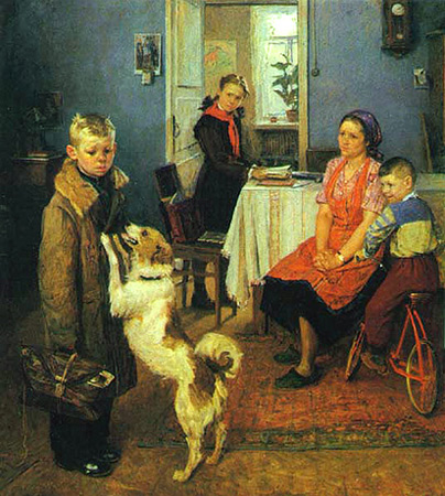 А окончательно добила художника, дважды сталинского лауреата, его собственная дочь с таким чудным именем Люба. И она тоже была отличница. Ну совсем как вот эта девочка на представленной картине, с укоризной и с чуть заметным превосходством смотрящая на младшего непутёвого брата. И вот Любочка приходит однажды вся в слезах из школы. Почему. Двойку получила! Ну что тут будешь делать. И художник понял, что в его будущей картине должна звучать совсем другая нота. Драматическая. Она куда как сильнее будет трогать душу зрителя.