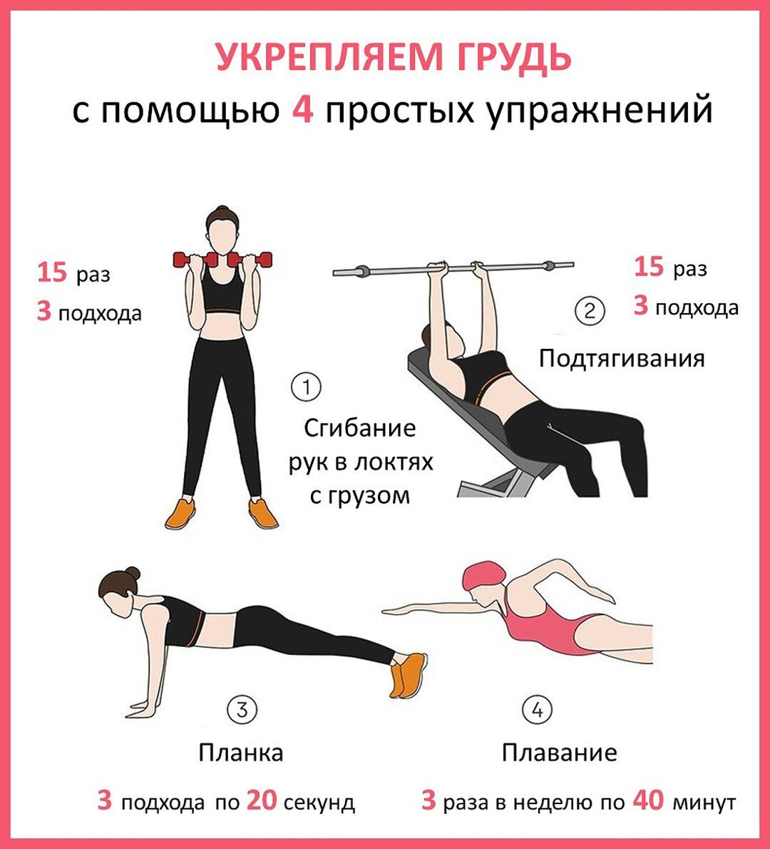 *** Не секрет, что с помощью определённых упражнений можно корректировать различные области тела. Например, тренировать грудные мышцы, чтобы подтянуть грудь и улучшить её форму🦋 *** Во время выполнения комплекса упражнений на укрепление груди улучшается кровоснабжение кожи и прилегающих к ней тканей, постепенно повышается её упругость и тонус, формирует стойкий эффект «естественного бюстгальтера», в котором расположена жировая ткань груди. Получается, что, выполняя упражнения на грудные мышцы, мы в той или иной степени укрепляем и подтягиваем кожу, которая поддерживает грудь☝🏼 *** Кстати, основной объём груди придаёт подкожный жир. Сами же грудные мышцы практически не влияют на размер бюста. При этом именно они обладают способностью приподнимать грудь, восстанавливая её привлекательность. Поэтому так важно тренировать данную группу мышц. *** 👉🏻Делаем вывод. Тренировки грудных мышц практически не влияют на размер груди, но помогают восстановить её упругость и улучшить форму. А восст