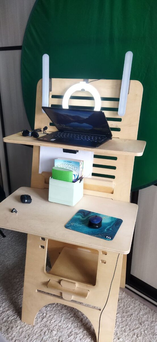 А используя возможности платформ видеосвязи, можно выставить любой задний фон, который не позволит клиентам отвлекаться от коррекционных задач. Важно отметить, что ваше положение тела во время проведения занятия должно быть удобным, а объектив камеры отображал бы вас анфас. Единственное, что нужно предусмотреть, это места для размещения освещения, микрофона, рабочих материалов. Я, в основном, предпочитаю работать сидя. Но иногда работаю и стоя. В обоих случаях я использую стол-конструктор.
