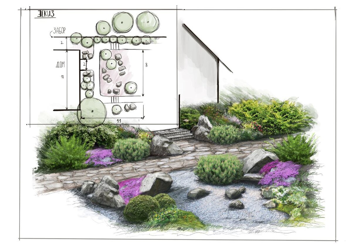 Показываю свои будни. Сегодня рисую весь день. План-вид сверху на небольшой кусочек участка у дома с перепадом высоты. Для большинства моих заказчиков вид сверху весьма неинформативен. Какие-то там кружочки, линии непонятные. Поэтому я всегда делаю визуализации, чтобы вы видели, как будет выглядеть та или иная часть вашего участка. Что за идея и что планирую посадить, рассказываю подробнее: Фасад дома у нас 10 м и до забора еще 2 м. По длине от дома примерно 11 метров. Идет небольшой перепад высоты, поэтому запланировала ступеньки по дорожке. С крылечка идет спуск в каменисто-гравийный сад. У дома планирую сажать кусты чубушника, сосны горные. Ивы нана. В качестве почвокровных будет флокс шиловидный. Он на рисунке розово-фиолетовый. Еще одна визуализация, чтобы показать полностью мою идею.