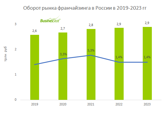По данным «Анализа рынка франчайзинга в России», подготовленного BusinesStat в 2024 г, в 2019-2023 гг оборот этого рынка в стране увеличился на 12%: с 2,6 до 2,9 трлн руб. Прибыльность и перспективность франшиз привлекала крупных инвесторов, а также малый и средний бизнес, способствуя росту рынка. Вместе с тем, до 2022 г все большее количество зарубежных франчайзинговых брендов обращали свое внимание на российский рынок. Международные компании видели в России большой потенциал и готовы были инвестировать во франчайзинговые проекты, чтобы расширить свое присутствие в стране. Такое сотрудничество стимулировало развитие отечественных франчайзинговых компаний и способствовало повышению качества и росту количества предлагаемых проектов.