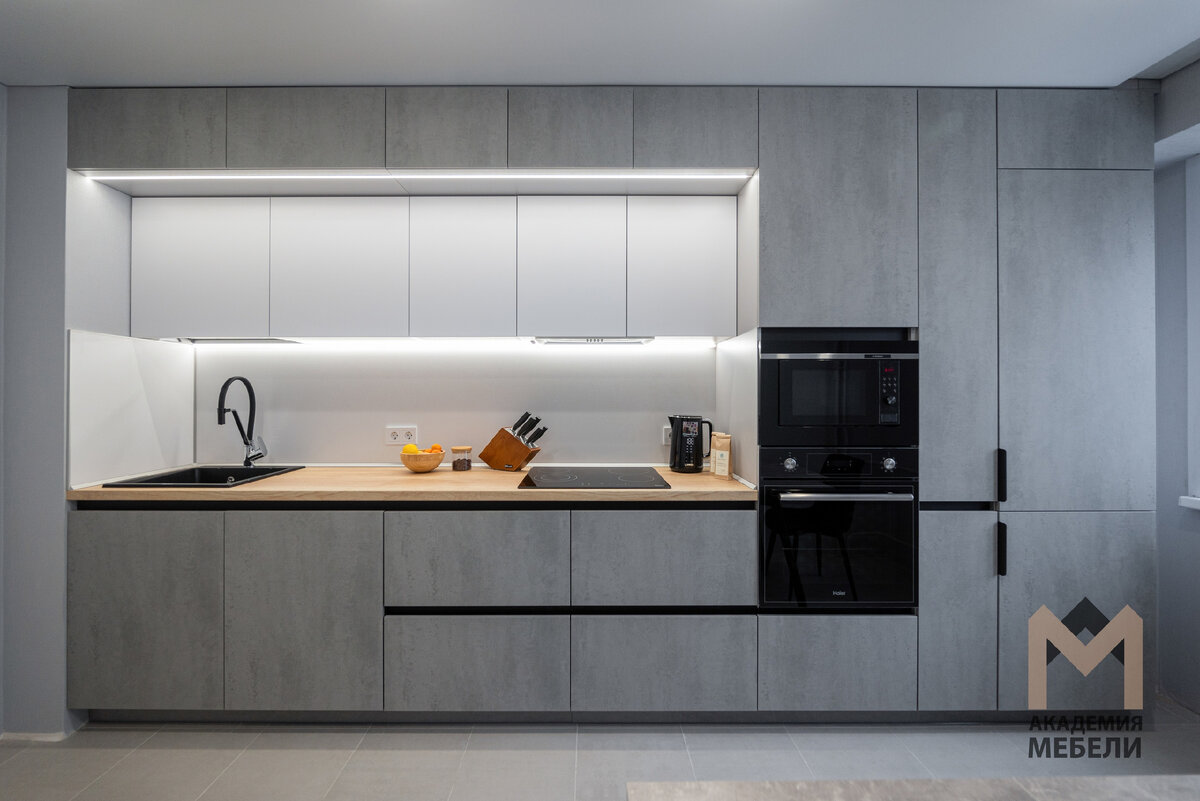 Установили прямую кухню на Дачной, 51 Создать стильное пространство в своем доме – мечта многих. Этого можно добиться с помощью нехитрых дизайнерских приемов. Например, гладкие фасады, скрытая бытовая техника, фасады из стекла. Но есть 3 классических способа, которые подойдут к абсолютно любой кухне. Именно их мы использовали в нашем новом проекте – прямой кухне на Дачной, 51. Первый прием – сделали два уровня. Верхний ряд имеет большую глубину, а средний утоплен. Это смотрится особенно эффектно, поскольку расположено вдоль одной стены. Неизменный плюс такого приема – огромная вместительность. Большое количество глубоких шкафов позволит спрятать посуду, крупногабаритную и мелкую бытовую технику. Несомненно, это еще и изюминка проекта. Во-вторых, кухня установлена под потолок. Это так же способ увеличить места под хранение. Высокие шкафы создают современный минималистичный вид и позволяют сохранять чистоту. Практичное решение с ноткой эстетики. В третьих, гармоничное сочетание цветов.