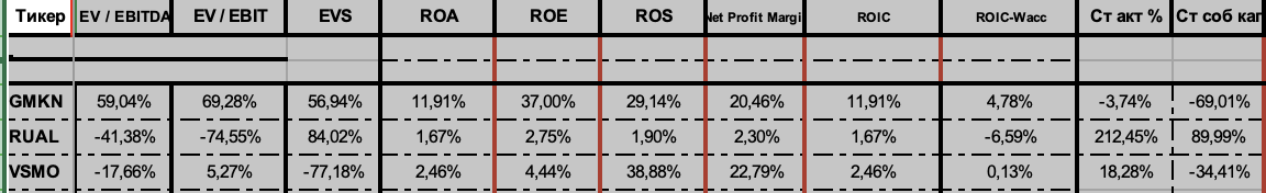 🎨Прогноз Цветных Металлургов GMKN, RUAL и VSMO Исходя из всех представленных данных, смотри таблицу, (EV / EBITDA, EV/EBIT, EVS, ROA, ROE, ROS, Net Profit Margin, ROIC, ROIC-Wacc, debt/ebitda, Debt/Equity, EV/ND) и анализируя компании GMKN, RUAL, VSMO с капитализацией до 400 млрд ₽, пришли к выводу, что компания Норникель выглядит наиболее предпочтительной для инвестирования и вот почему 📊 Проведем анализ трех крупных компаний: GMKN (ГМК Норильский Никель), RUAL (РУСАЛ) и VSMO (ВСМПО-АВИСМА), учитывая их финансовые показатели. 1. GMKN (ГМК Норильский Никель) 2. RUAL (РУСАЛ) 3. VSMO (ВСМПО-АВИСМА) Дивиденды: Дивидендная доходность приблизительно в районе от 1,5-2%. Ожидаемый период выплат за 2023: реестр: 14 июня 2024. Так же 26.12.2024 реестр за 9 мес 24 года, див. 2,3% - Цена у аналитиков(см.скрин) - 13400 – 20000₽ ( большинство - рекомендуют держать ) - Сделка инсайдеров (см.скрин) - нет данных 📰 Новости и мнения: - При текущих ценах на металлы свободный денежный поток (FCF) у нас
