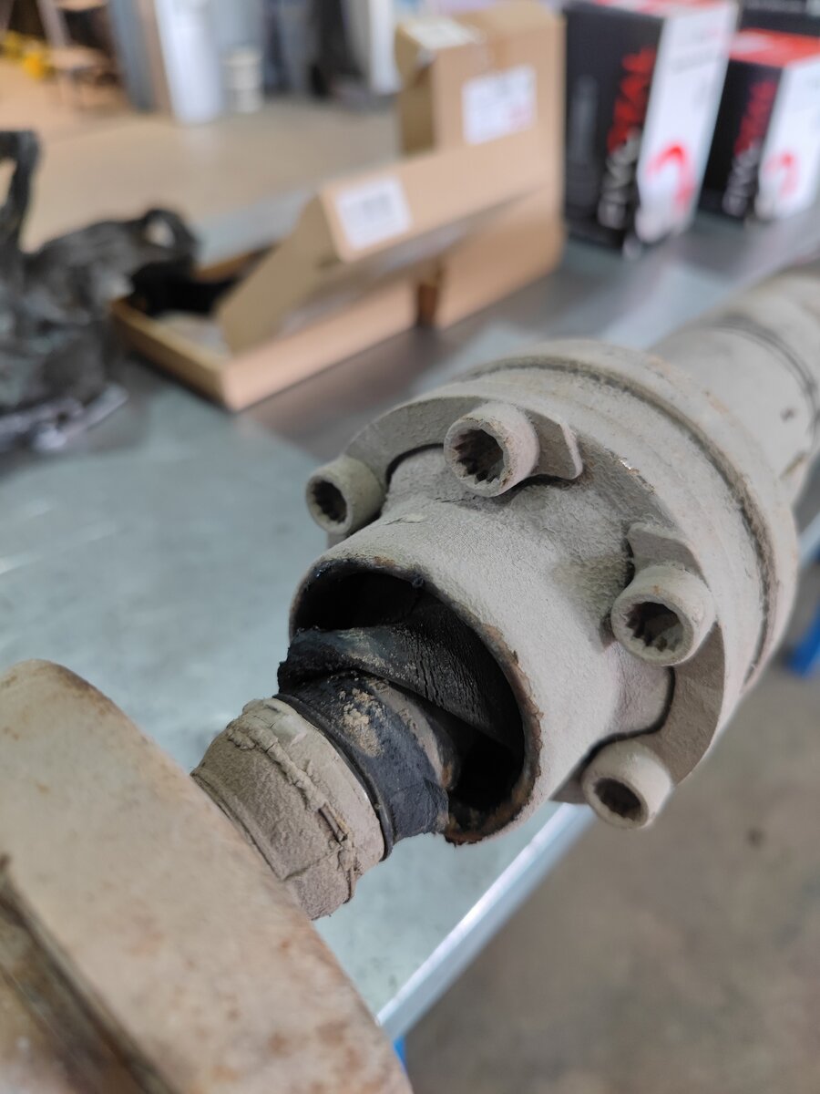 Порванные пыльники, разваленные и люфтящие шрусы, шумящие подвесные - с таким букетом болезней к нам поступил в работу карданный вал от Volkswagen Transporter. Мы буквально его собрали заново, от прежнего кардана остались только трубы. В процессе ремонта были использовали проверенные временем польские шрусы и шлицевые концы к ним. Концы переварили, шрусы заменили. Также установили новые опоры с подшипниками FAG, после чего кардан отбалансировали и открасили.