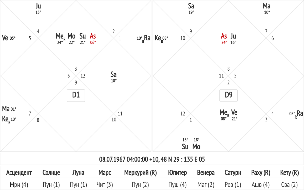 Интересная реализация положения Юпитера в накшатре Пушья, 4 пада. Юпитер это наша философия, то мировоззрение, которое складывается у нас в течение жизни, вера, которой мы придерживаемся. В данном случае принципы заботы, опеки, ограждения от опасностей окружающего мира со временем формирует идеологию Скорпиона. Скорпион это контроль и своего рода философия... насилия. Делая синтез этих параметров получаем насильственную заботу. Юпитер стоит во втором доме, связанном с питанием. Женщина, чей гороскоп мы рассматриваем, придерживается принципов здорового питания. И заставляет соблюдать эти принципы своего супруга (Юпитер - хозяин 7). Она контролирует всё, что он ест, жёстко ограничивает рацион мужчины, следит за его пищевыми привычками мотивируя свои действия заботой о его здоровье. Она верит, что отсутствие у мужа хронических заболеваний и лекарственной терапии в достаточно солидные годы результат именно её стараний. Вообще Пушья довольно коварная накшатра. Не смотря на положительный о