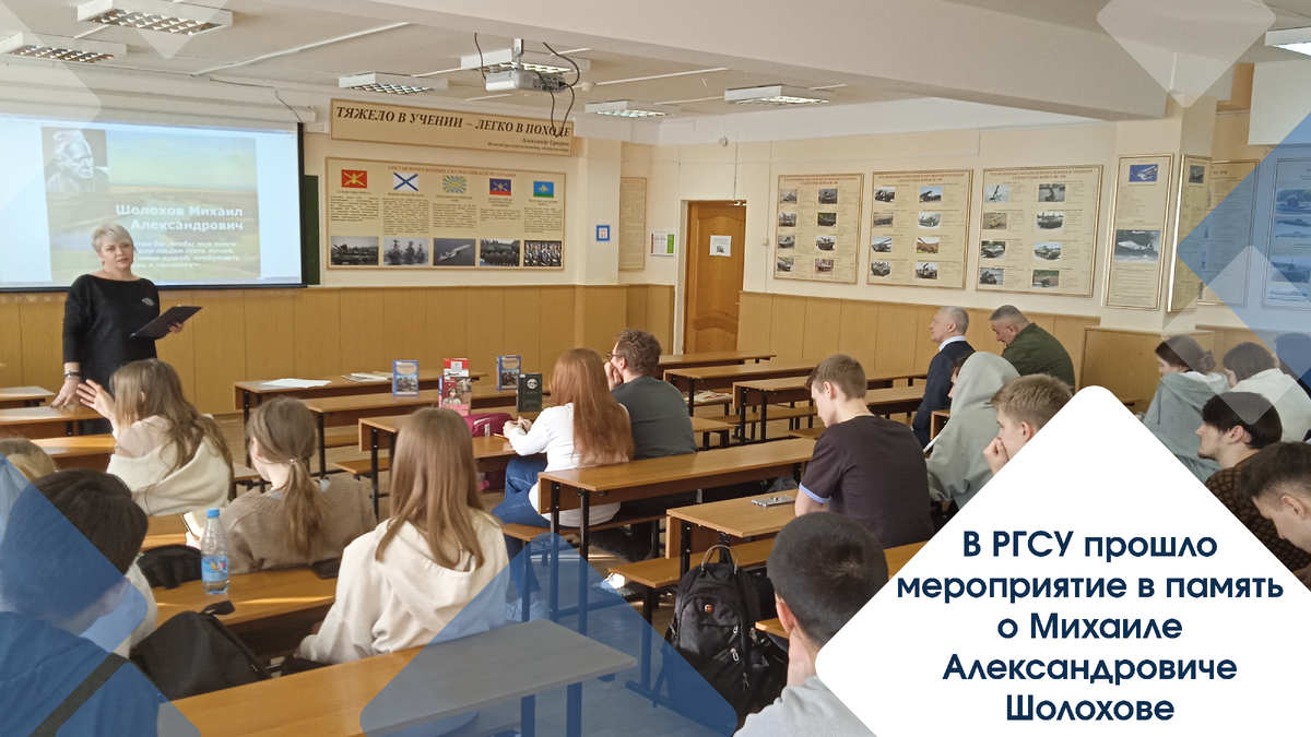 На факультете комплексной безопасности и основ военной подготовки РГСУ состоялось памятное мероприятие в честь великого сына Дона, русского писателя, лауреата Нобелевской премии по литературе Михаила Александровича Шолохова. Литературный вечер организовал Центр военно-патриотического воспитания РГСУ совместно с Центральной библиотечной системой Московской области. Информационную поддержку оказал Государственный музей-заповедник им. М.А. Шолохова. Владимир Владимирович Леонов, декан факультета комплексной безопасности и основ военной подготовки РГСУ, и Оксана Михайловна Чернуцкая, руководитель юношеского отдела библиотеки им. Б. Заходера, рассказали о родных казачьих станицах Донского края и поделились интересными фактами из жизни казачества. Наши ребята узнали о судьбе Михаила Александровича Шолохова – писателя, журналиста и киносценариста. Студенты РГСУ отметили, что им особенно понравились исторические хроники из Государственного музея-заповедника им. М.А. Шолохова о его рабочих буд