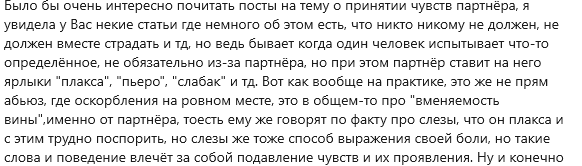 Тем не менее я все же считаю, что постоянное рассусоливание в интернете таких понятий как "абьюз", "газлайтинг", "буллинг", "обесценивание" или "нарушение личных границ" приводит к каким-то странным результатам. Нет, мы, конечно, должны называть вещи своими именами, надо же уметь отличать насилие любой формы от эмпатичности и сопереживания. И уметь о нем говорить.