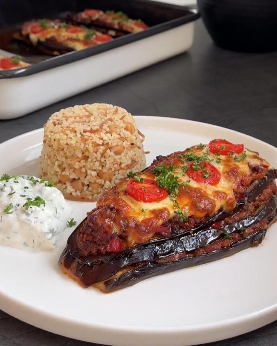 Получается чудесная тарелка с знакомым нам вкусом, но с подачей. Обязательно попробуйте 😍 Материалы: 2 больших и толстых баклажана Для начинки: 5 столовых ложек масла, немного соли и черного перца. Фарш: 200-250 г фарша 1 луковица 2 зубчика чеснока 1 зеленый перец 1 красный перец 1 столовая ложка томатной пасты 7-8 столовых ложек томатного соуса 1 чайная ложка тимьяна 1/2 чайной ложки красного перца, сладкого 1/2 чайной ложки черного перца 1/2 чайной ложки перца чили Соль 200 мл горячей воды 1 чайная ложка томатной пасты 1 столовая ложка оливкового масла соль и перец тертый сыр Подготовка: Разрезаем баклажаны ножом вдоль. Затем положите его в миску, залейте водой и добавьте немного соли. После 20-минутного отдыха слейте воду и высушите. Выложите баклажаны на противень. Смешайте масло с солью и перцем и намажьте ломтики. Выпекать в разогретой до 220 градусов духовке около 20 минут. Тем временем приготовьте фаршовую смесь. Для этого лук сначала немного