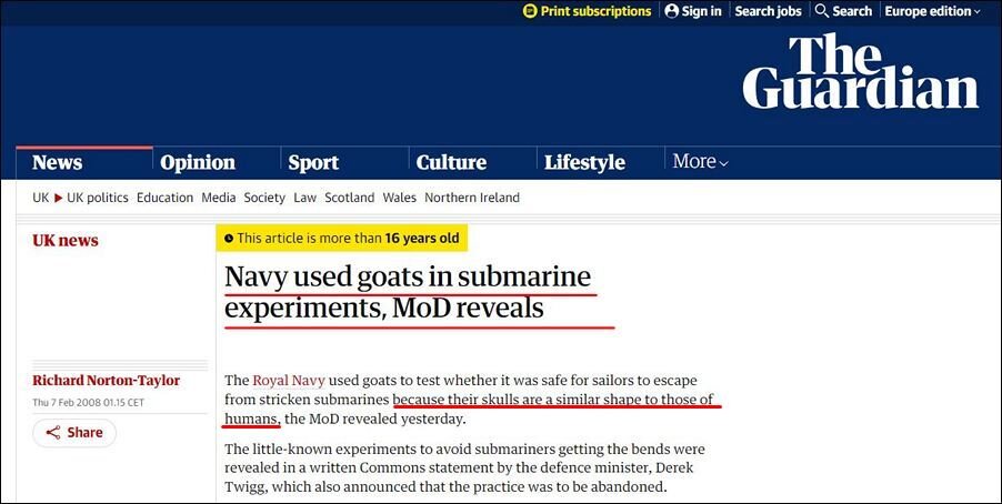 Вот все смеются над британскими учёными, а меж тем они установили, что черепа коз наиболее похожи на человеческие. Не верите? А вон я в тексте статьи из "Гардиан" это утверждение подчеркнул: Статья достаточно старая, но раньше на глаза не попадалась. Предлагаю перевод: "Военно-морские силы использовали коз в экспериментах на подводных лодках, сообщает Минобороны Королевский флот использовал коз, чтобы проверить, безопасно ли морякам спасаться с потерпевших крушение подводных лодок, поскольку их черепа по форме напоминают человеческие, сообщило вчера Министерство обороны. Малоизвестные эксперименты по предотвращению травм подводников были раскрыты в письменном заявлении министра обороны Дерека Твигга, в котором также было объявлено, что от этой практики следует отказаться. Живых коз на протяжении десятилетий использовали на базе военно-морского флота в Госпорте, недалеко от Портсмута, в рамках исследования эффектов различной степени декомпрессии. Животных помещали в барокамеры с гиперба