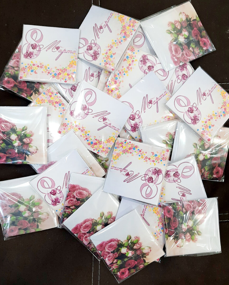 Так как праздник уже близко и делать было нечего, а дело было вечером :) . Пришла идея сделать подарки на 8 марта ! Хотелось что-то интересное придумать. Недолго думая посидел, посмотрел в интернете и случайно увидел открытки с шоколадками. Вот и решил, почему бы и мне такие открытки не сделать своими руками. Нашёл в интернете фото цветов и надписи с 8 марта. Все картинки и надписи вставил в документ Microsoft Word, пришлось немного времени посидеть отредактировать фото, и фото подогнать для печати. Немного листов пришлось испортить при печати, как не как пробные листики были. Потом соответственно распечатал на фотобумаге с двух сторон. Бумага взята была с одной стороны глянцевая, а с другой матовая простая подложка. Вот дальше самое интересное это надо все фотографии получившиеся вырезать аккуратно. Шоколадки я клеил на двух сторонний тонкий скотч, держатся шоколадки отлично. Уголки на открытке я сделал специально закруглённые, смотрится красивее. Потом всё это аккуратно складыв