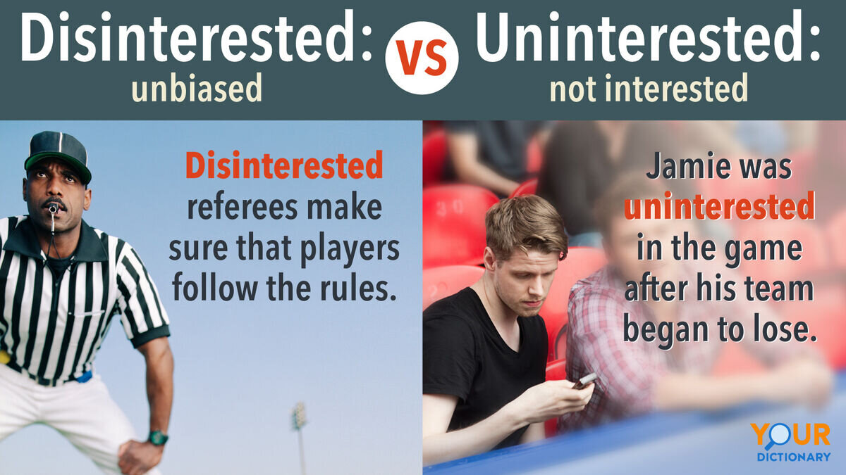 - "Uninterested" обычно означает "незаинтересованный" или "неинтересный", в то время как "disinterested" означает "беспристрастный" или "объективный". Однако многие люди ошибочно используют эти слова взаимозаменяемо, что может привести к недопониманию. Например, если вы говорите: "I am absolutely disinterested in this project", это может быть неправильно понято как "Я абсолютно не заинтересован в этом проекте", хотя вы на самом деле имели в виду "Я абсолютно беспристрастен в этом проекте".