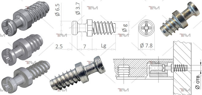 103 30 • Шток эксцентрика AZ / KS, с резьбой по дереву, Combi PZ2 натяжной размер Sm = 7 мм (по штоку) присадочный размер Bm = 9 mm (по плите) Материал: zamac (цинковое литьё под давлением) Техническая информация без покрытия