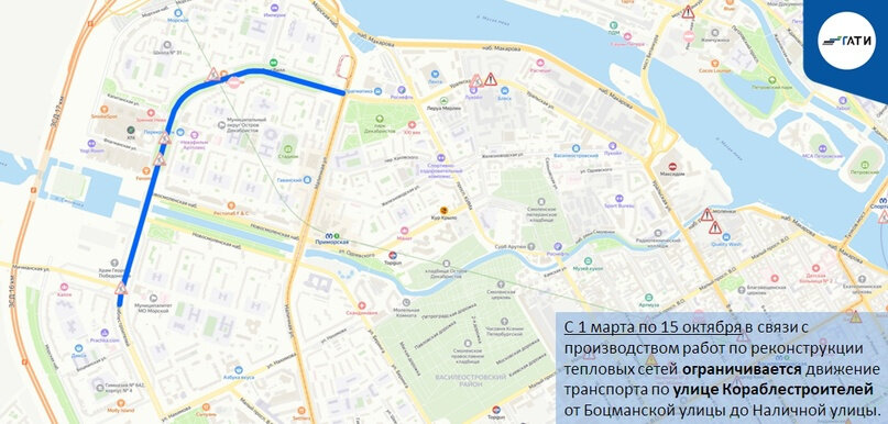 Обуховской Обороны, Кораблестроителей, Восстания. Где в Петербурге весна начнется с ограничений В первый день весны работы на сетях, ремонт трамвайных путей и временные ограждения изменят схему движения сразу в шести районах Петербурга. Самые долгие — до середины октября — ждут центр и Васильевский остров. Василеостровский район До 15 октября ограничат движение транспорта по улице Кораблестроителей — от Боцманской улицы до Наличной улицы, сообщает 28 февраля пресс-служба Государственной административно-технической инспекции Петербурга. Там будут реконструировать теплосети. Выборгский район До 14 апреля из-за реконструкции электрокабеля ограничат проезд по Гренадерской улице у пересечения с Большим Сампсониевским проспектом. Калининский район До 9 апреля ограничат движение по Минеральной улице от Арсенальной улицы до тупика. Там тоже запланирована реконструкция электрокабеля. Невский район Работы по реконструкции водовода до 11 марта перекроют участок улицы Тельмана у пересечения с прос