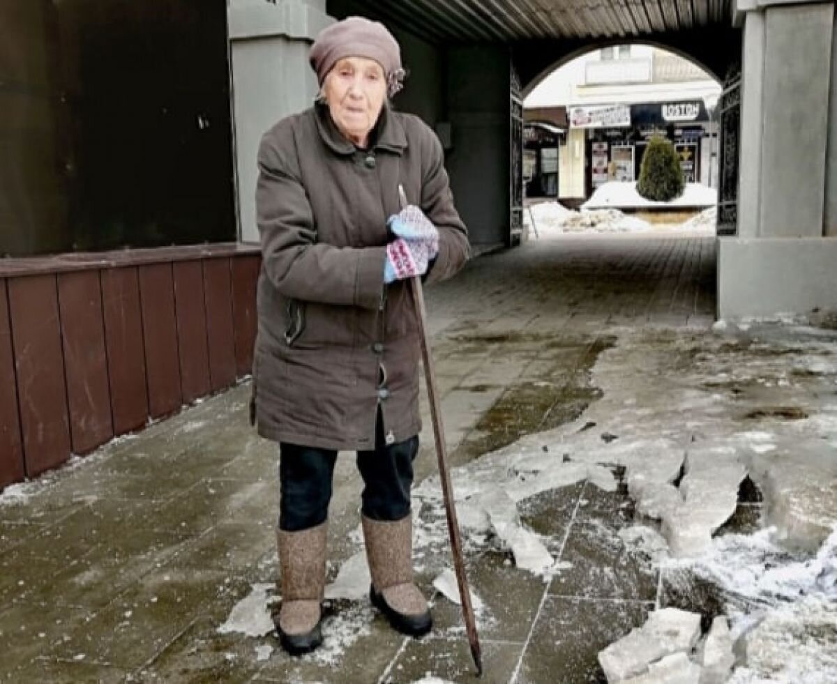 По словам автора публикации, на борьбу со скользкими дорогами вышла 83-летняя жительница улицы Ленина. В своем дворе женщина колет лед самостоятельно. «Это поколение не сломить!», - восхищается автор публикации.