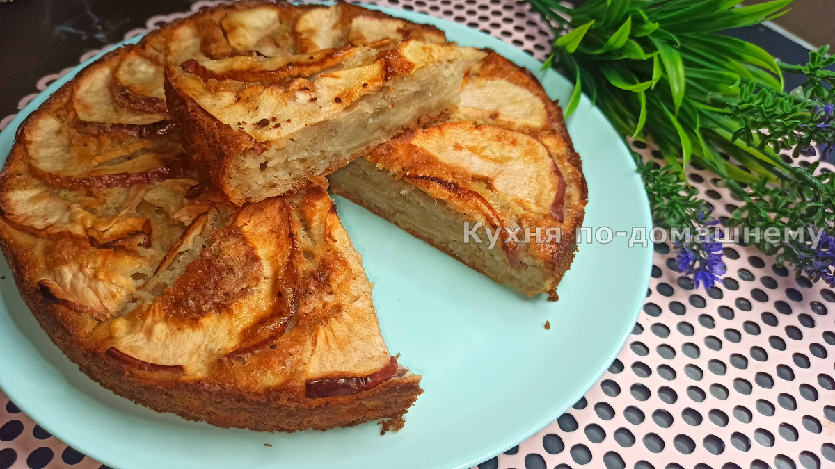 *Бока формы смазать сливочным маслом *Перемешать тесто с нарезанными яблоками, выложить в форму, выстеленную пергаментом. *Половину яблока с кожурой нарезать на тонкие пластинки и выложить сверху на тесто *Посыпать сверху 1 ч.л. сахара *Выпекать в духовке, заранее прогретой до 180°C, 30-40 минут. *Готовность пирога пр