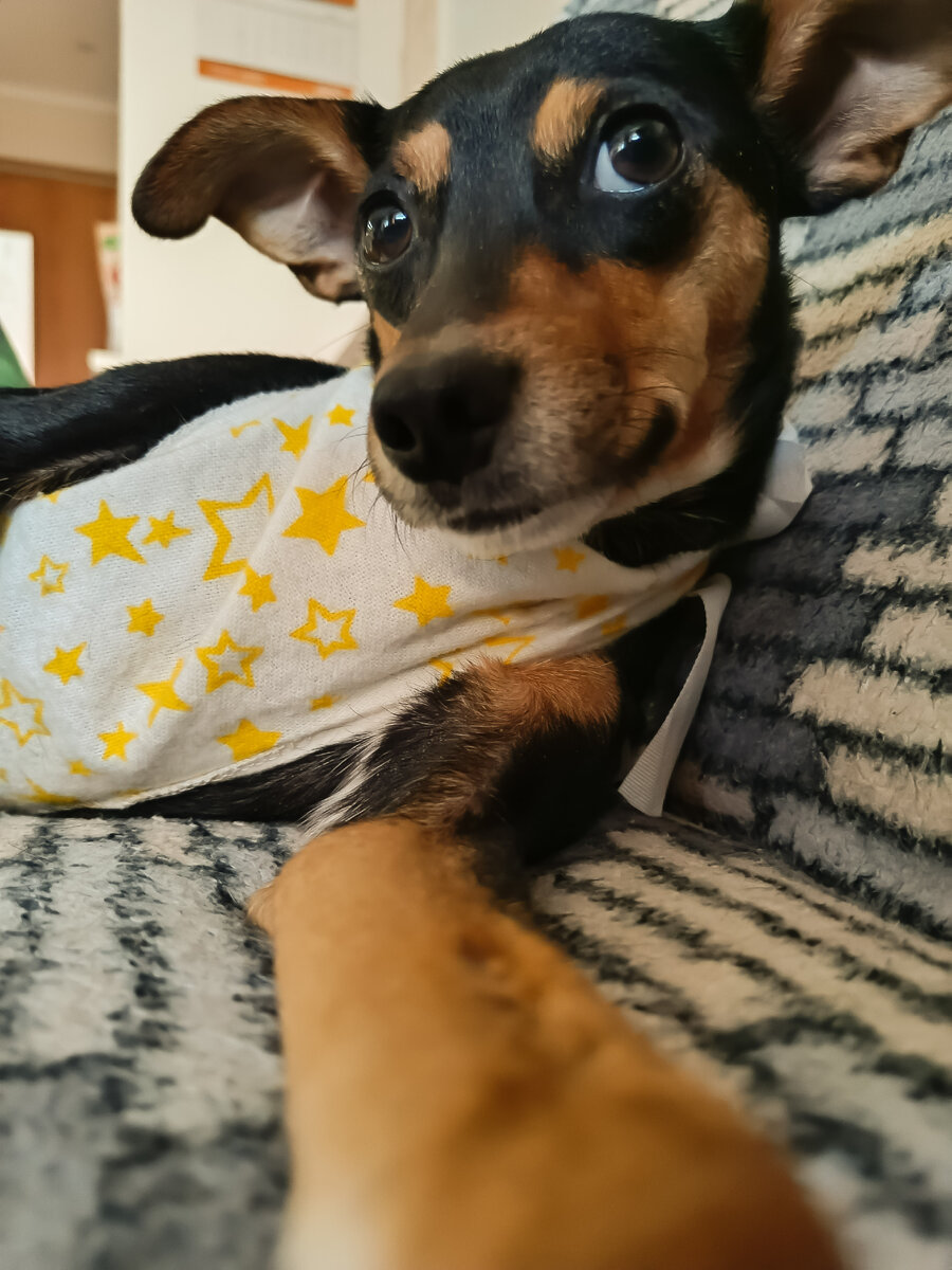 Дину мы нашли на улице. В январе прошлого года. Я вышла из машины и увидела её..Она стояла на своих тонких ножках, и как осинка покачивалась на ветру. Январь тогда был очень холодным да ещё и с пронизывающим влажным ветром. Когда я присела чтобы погладить ее, она с радостью, виляя хвостиком, точнее тем,что он него осталось, подбежала ко мне и положила свои лапки мне на плечи и лизнула меня в нос. Это было так мило.. Потом мы узнали у продавца, что она уже неделю тут живёт. На улице.. Зимой.. Дома у меня уже была собака, кошки, но я не могла оставить её тут замерзать. В машине она согрелась и быстро уснула. Дома она просто лежала.. Организм полностью отказывался от любого приёма пищи и воды. В больничке поставили несколько уколов, ещё дали с собой. Через пару дней она начала приходить в себя... Начала помаленьку пить, затем кушать.. детское мясное пюре по 1 чайной ложечке... Для нас и это было уже радостью.. Летом она, низко летя над землёй, сломала лапку. Ездили в другую станицу в