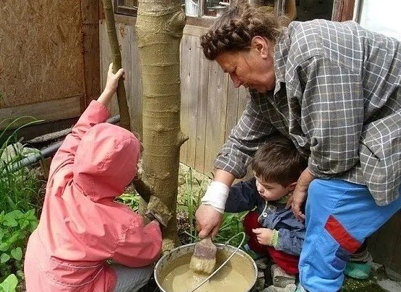 Самой ранней весной я обмазываю стволы специальной смесью. Срезы лучше замазывать варом. А раны и трещины - лечебной болтушкой. Для предупреждения солнечных ожогов и заживления морозобойных трещин. Беру глину, развожу ее водой и настаиваю не меньше двух дней, чтобы все комочки в растворе размякли. А потом добавляю в эту болтушку свежайший коровий навоз (конский лучше, но мне его не всегда удается достать). смесь по консистенции напоминает сметану 30% жирности или раствор для оштукатуривания. Т.е. набухшая глина становится как жидковатое тесто для пирогов (раздробить, замочить на сутки, периодически размешивая, и потом процедить от твердых частиц через сетку 7х7мм - примерно). Затем в пол-ведра глины вносится полведра навоза и опять размешивается. А затем добавляется 100г медного купороса (примерно стакан) и опять перемешивается. Такую смесь легко брать мастерком, кистью, она хорошо прилипает, не сползает ни тонким ни толстым слоем, легко принимает форму ствола. После высыхания све