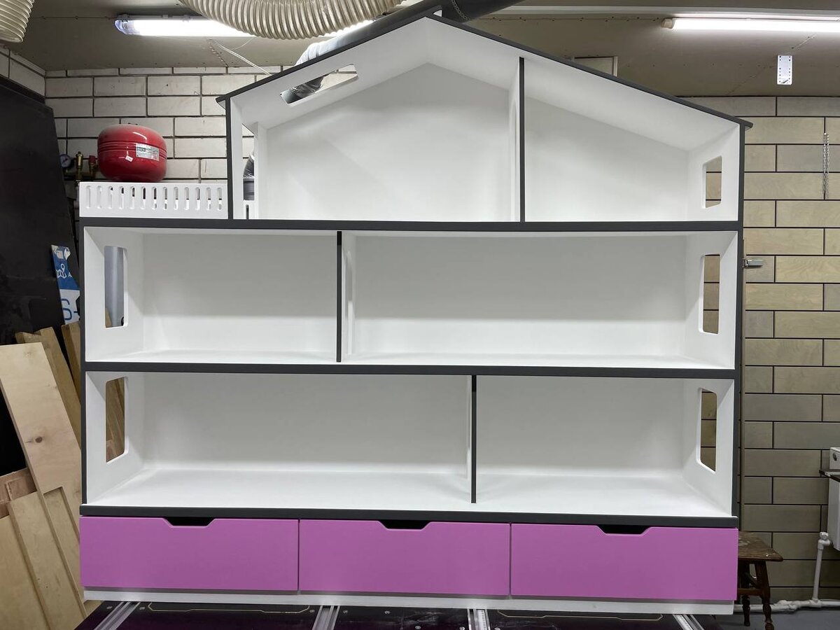 Первоначально домик должен был быть 90х60 см, но в процессе разработки и общения с заказчиком, поняли, что надо добавить еще пару этажей, и сделать снизу ящики для хранения игрушек.