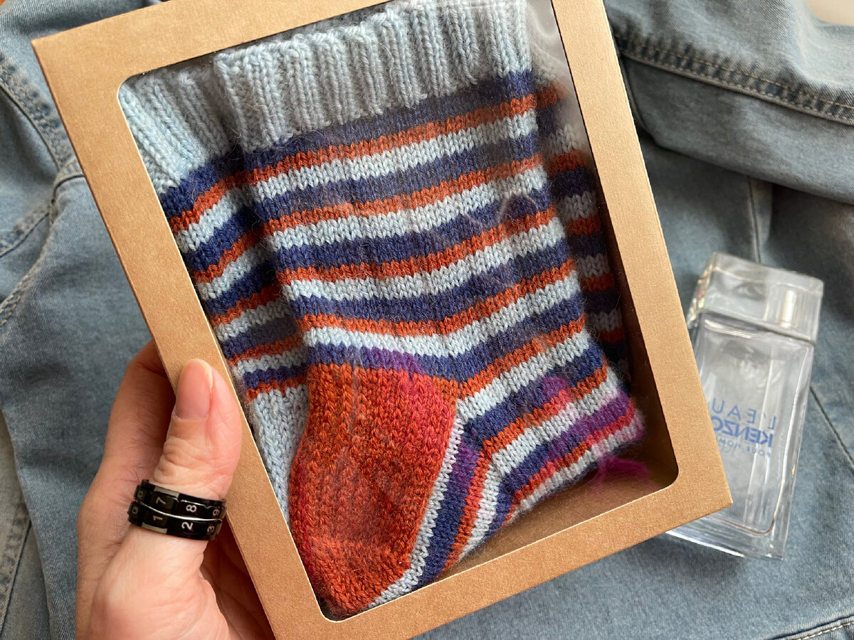 Очевидно, что голубого цвета можно было использовать больше остальных, и я связала первый носочек с голубой резинкой, пяткой и мыском. Взвесила остатки и поняла, что на второй носок ниточку надо распределять по-другому, но одного цвета не хватит связать все части второго носка, как первого. Связала резинку снова голубым цветом, а вот пятку и мысок, на свой страх и риск, взялась сделать кирпичным. Мысок вязала и сердце сокращалось каждый ряд, наблюдая как стремительно уменьшается оранжевый клубочек. Перебирала в голове варианты, как выходить из положения, если нужного цвета всё-таки не хватит? И, о Боги! Закончила убавки, сшила петли мыска и осталась ниточка длиной 12см! Двенадцать, Карл!!! Фух 😓 Левый и правый носочек готов!
