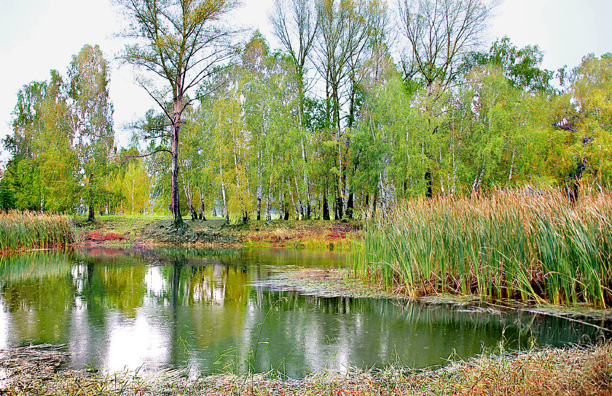 Под камышами тина бледная сияет, над ними ветерок кружит. Озеро лесное деревья окружают, ветви склонились над водой,