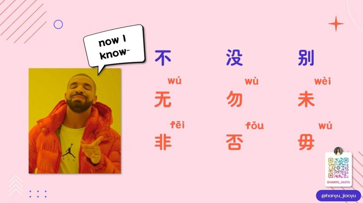 В этой статье рассмотрим многочисленные "не" в китайском языке (про 不没别 рассказывала в прошлой статье): 1) 无 wú - обычно в "无 + сущ. / местоимение", в побудительных предложениях ~ 不要, в других случаях ~ 不: