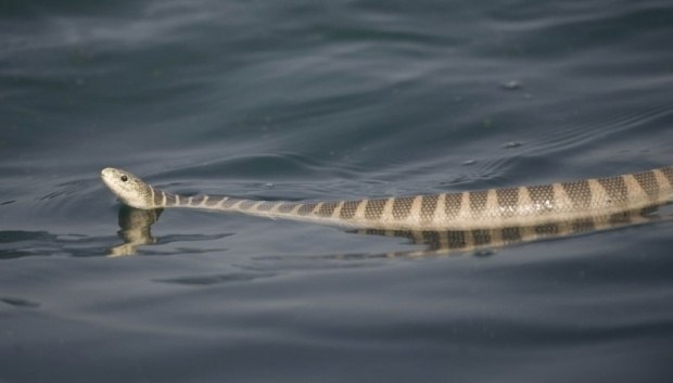 Рядом с берегом Сергей замечает зеленовато-серую с тёмными полосками змею длиной около метра. Сергей понимает, что это энгидрина – морская крючконосая змея.