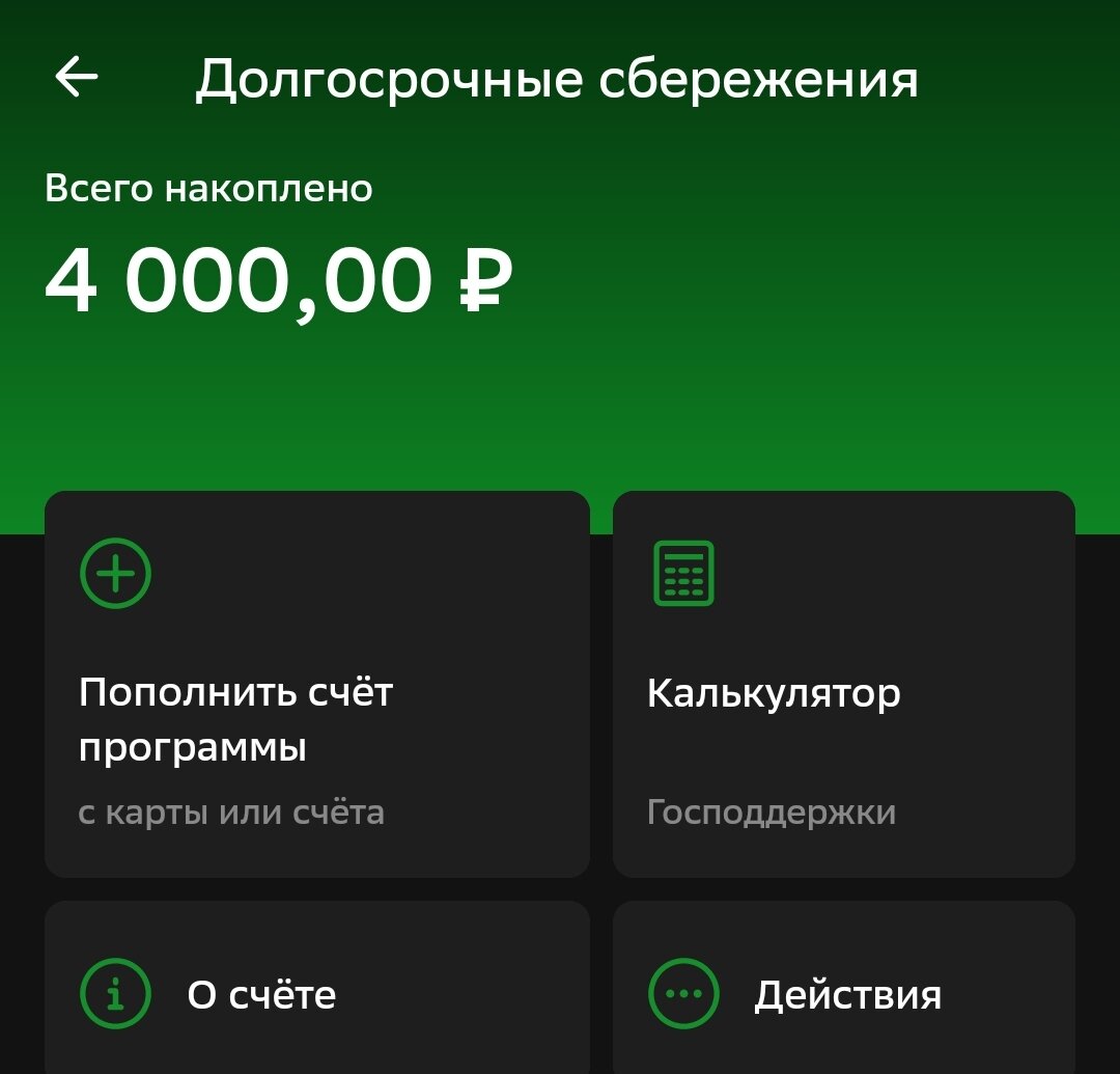 Вчера пополнил счет ДОЛГОСРОЧНОГО ПЕНСИОННОГО НАКОПЛЕНИЯ на очередные 2000 рублей. В январе 2024 начала действовать данная программа и я в один из первых дней подключился к ней. Пришлось побегать -планировал открыть её в ВТБ, однако сотрудники отделения даже не в курсе, что существует подобная программа. Пришлось открывать в Сбере. Ибо, Сбер- наше ВСЁ! Сделал онлайн за пару минут. Минимальный платёж 2000 рублей. Настроил автоплатёж на 2000 р. Вчера было первое списание. Теперь на счете 4000р. Что же такое Договор длительного пенсионного накопления (ДПН)? По сути, это среднее между вкладом и покупкой облигаций. Только срок размещения минимум 5 лет. Чем же отличается от депозита на 5 лет?! Первое, с суммы пополнения можно получит налоговый вычет в конце года. 13% от пополнений. Второе, про пополнении счета, государство увеличивает сумму до 50% на счете. Например, если вы положите 50 000 р. Государство доплатит 25 000 р. Итоговая сумма, которая будет у вас на счете 75 000 рублей. Выгод