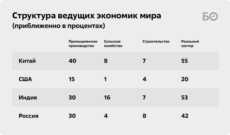 При оформлении моей прошлой статьи, например, вкралась ошибка, которую заметили некоторые внимательные читатели. В таблице, составленной мной, на 1-м месте должен быть Китай, а не США. Такого рода расхождения мешают правильно оценивать ситуацию, поэтому я считаю нужным все-таки этот момент исправить, показать мой вариант таблицы (ниже), где можно видеть соотношение реального сектора экономик разных стран.