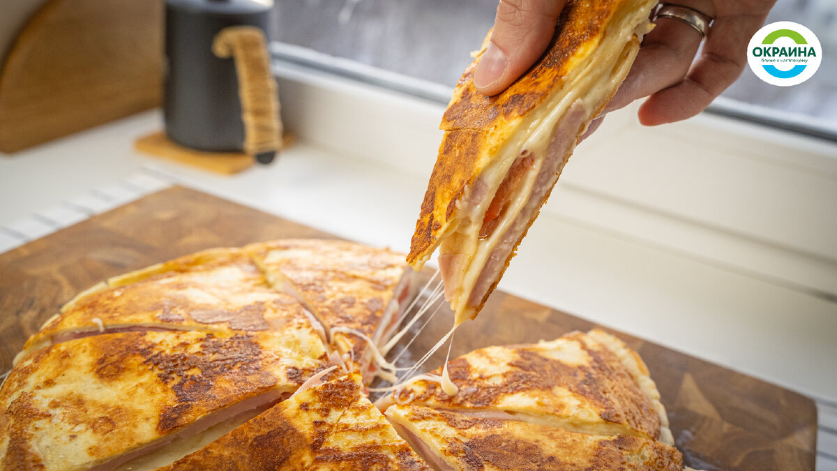 • сливочное масло - 10 г. 1. Сначала смажьте сковороду сливочным маслом, затем яйца посолите и приправьте перцем, тщательно перемешайте. 2. Половину яичной смеси вылейте на сковороду, после чего выложите лаваш, распределите ветчину и тертый сыр. 3. Второй лаваш выложите поверх слоя с колбасой и сыром, затем нарежьте помидор тонкими ломтиками и выложите их на лаваш вместе с сыром. 4. Третий лаваш положите сверху и снова распределите на нем ветчину и тертый сыр. 5. Последний лаваш положите сверху, после чего распределите оставшуюся яичную смесь по всей поверхности. 6. Накройте сковороду крышкой и готовьте завтрак на слабом огне в течение 5 минут. После этого переверните и продолжайте готовить еще 5 минут под закрытой крышкой. Вкусный и сытный завтрак готов!