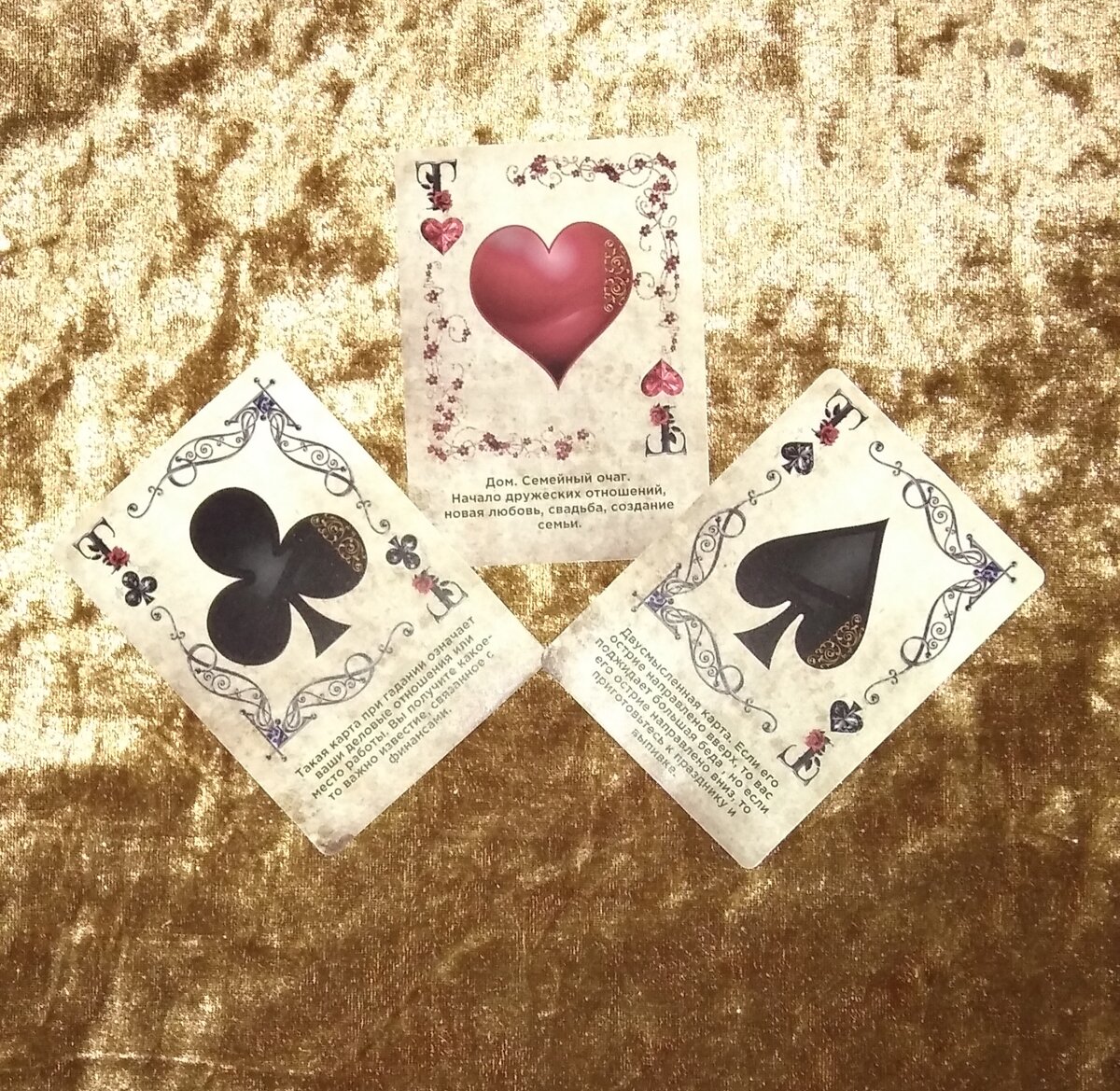 Следующая позиция, тоже из трех карт. А дома могут происходить ссоры, конфликты. На это указывает семерка пик. Отсюда и ваше беспокойство. Неприятности, скорее всего, с родственниками. Кто-то без вас может ругаться в вашем доме. Особенно если вы сейчас не знаете, что происходит внутри ваших стен, если вы не дома. Здесь шестерка треф показывает, возможно, вашу дорогу, разлуку с родственниками, с любимым, может быть, человеком. Либо же кто-то из вашего родства, ближних, родственников, которые с вами проживают, на данный момент они отсутствуют дома. По делам, по работе уехали, на заработки, в командировку. И в таком случае вы тогда ожидаете позитивных известий от них, скорого возвращения, звонка, оповещения, смс, что с ними все хорошо, ну либо с каким-то конкретным человеком. Какую-то информацию вы ожидаете, что должна прийти в ваш дом. Вам необходима эта новость. Вы ждёте приятных вестей. Ну, бубновый туз может напрямую показывать документы. Особенно если вы накануне, либо сейчас продолжаете заниматься оформлением каких-то ценных официальных бумаг, вот вы находитесь непосредственно в ожидании решения вашего вопроса. Может быть, вопрос с домом, с недвижимостью сейчас для вас как главным является. Далее...