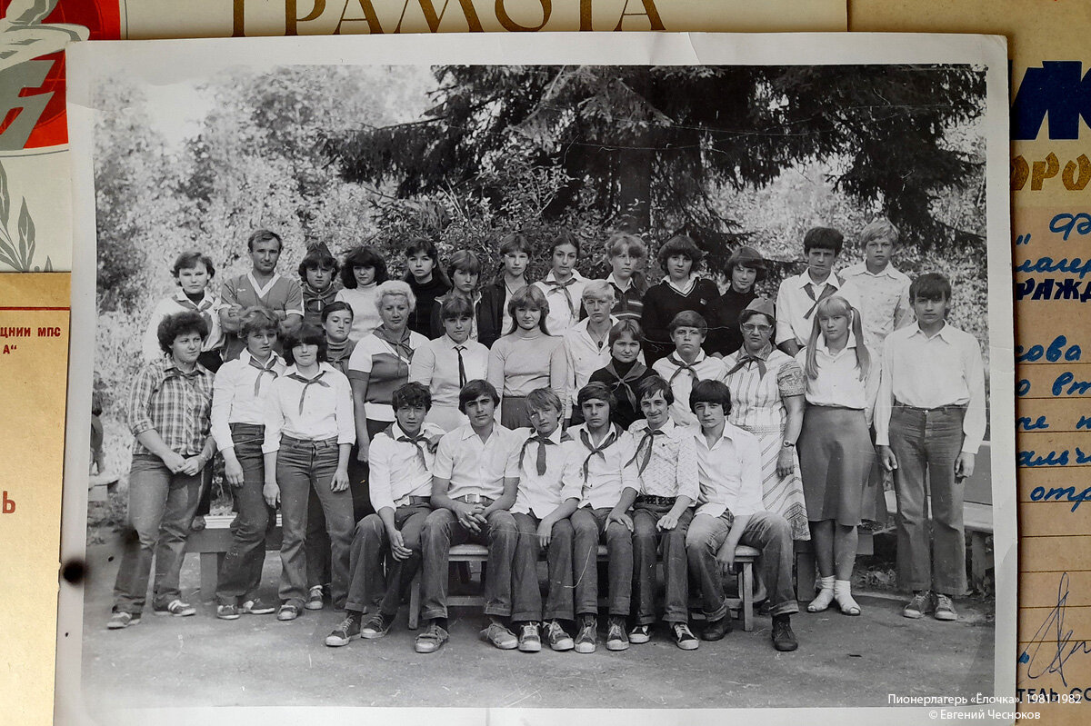 «Это время ушло, и ушло навсегда и случайно вернулось ко мне»,- заметил однажды поэт. Такое бывает. Ушедшее время вернулось в случайно обнаруженной в стенном шкафу круглой железной коробке, заполненной рулонами негативов, большей частью отцовских, но один толстенький рулон был подписан детским почерком: «п/л Ёлочка. 1981-1982». Намотанные одна на другую несколько плёнок оказались изрядно поцарапаны рамкой фотоувеличителя. Даже в таком убитом качестве кадры показались атмосферными и после оцифровки пригодились для иллюстрации эссе про летний отдых в пионерлагере «Ёлочка».