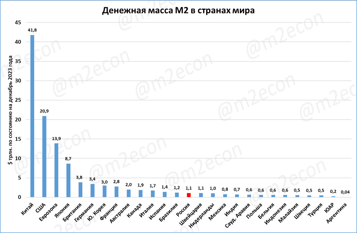 Рассмотрим сразу несколько рейтингов. Базовый рейтинг стран, где лидирует Китай. Рейтинг валют, где на сцену выходит евро. А также рейтинги стран Брикс и "большой семёрки". Рейтинг стран Для начала сам рейтинг в виде графика. Для сопоставимости все денежные массы пересчитаны в долларовом эквиваленте. Первая четвёрка заметно отличается от остальных стран. На первом месте Китай, денежная масса которого 41,8 трлн. в долларовом эквиваленте. На втором месте США: 20,9 трлн. На третьем месте Япония: 8,7 трлн. в долларовом эквиваленте. Стоит обратить внимание на то, что Япония по этому показателю третья в мире, если учитывать только отдельные страны и не учитывать группы стран (Еврозона). Следующая по порядку страна, Британия, отличается от группы лидеров очень сильно. Её денежная масса ($3,8 трлн.) более чем в два раза меньше японской. Денежная масса в России составляет 1,1 трлн. в долларовом эквиваленте. В рейтинге стран это 13-е место по размеру денежной массе (не учитываем Еврозону, пото