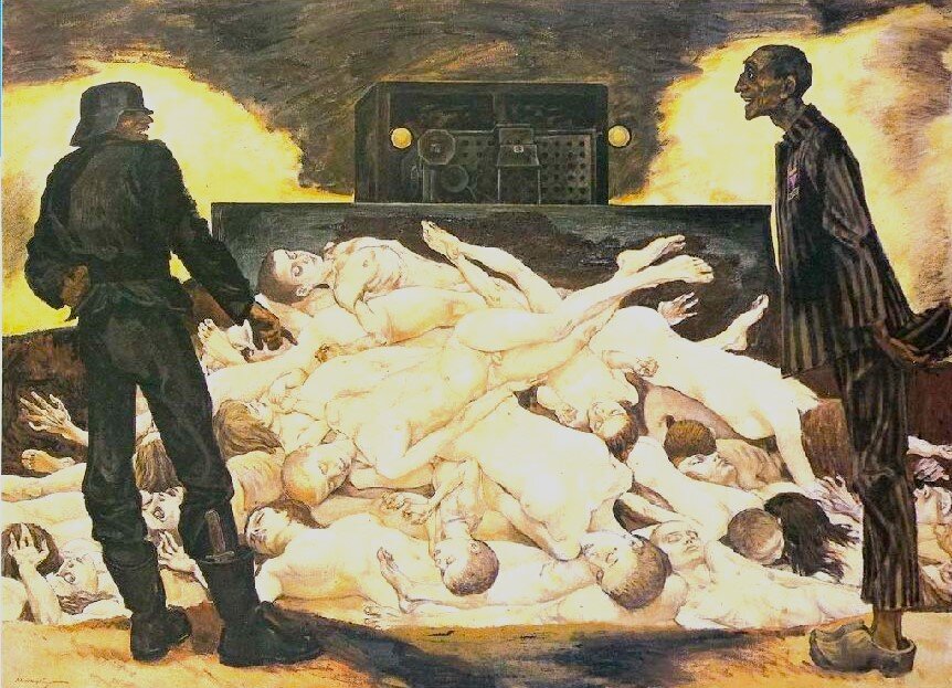 А однажды он взял и привёз в хмурые советские годы за границу картину – где концлагерь: с одной стороны стоит фриц, посредине штабель убитых людей – а с другой стороны… еврей-прислужник, с подобострастным лицом глядит на фрица: «Чего изволите? Прибрать?»