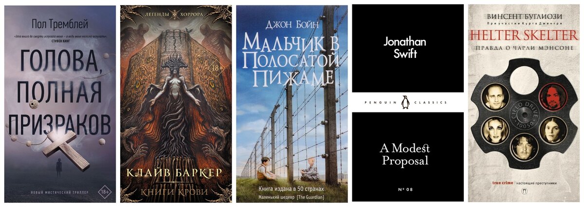 Пол Тремблей — Голова, полная призраков. История записи реалити-шоу, где до самого конца непонятно, вселились ли в ребёнка демоны, или это просто выпендрёж для привлечения внимания, а в конце оказывается, что главный ужас и вовсе в другом. Клайв Баркер — Книги крови. Шесть сборников рассказов, которые обычно издаются в 2-3 томах. Рассказы разного уровня, но действительно страшных и небанальных большинство. От боди-хоррора до психологической жути, но если прочитать их подряд, то можно объесться. Лучше употреблять понемногу. Джон Бойн — Мальчик в полосатой пижаме. Простое, а временами даже наивное повествования о мальчике, который искренне не отдупляет, что такое концлагерь, хотя живёт буквально при нём. Многое кажется нереалистичным, но если читать с эмоциональной точки зрения, то книга выжмет вас до последней капли. Джонатан Свифт — Скромное предложение. Маленькое сатирическое эссе от Джонатана Свифта (есть на русском языке), где он как будто бы на серьёзных щщах предлагает есть детей