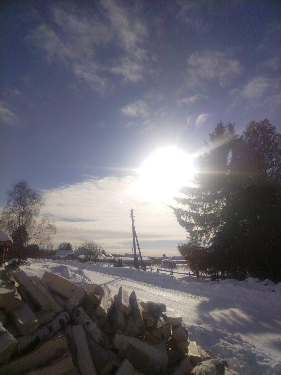 17 февраля. Мороз около -20°. Солнечно. Небо голубое, почти как в марте. Знаешь, в марте небо голубое голубое и тёплое. Сегодня небо тоже голубое, но вот тепла пока не ощущается. Чурки лежат в куче под снегом и ждут моего прихода. Да иду я уже, иду! Топор с глухим стуком впивается в деревянное тело чурки раскалывая её пополам. Работа началась. Чурка за чуркой раскалываются под ударами топора превращаясь в тонкие жёлтые полешки. Только начал колоть, а мне уже попадаются комеля. Одни тонкие, другие толстые. Топором комеля колоть, то ещё удовольствие, но у меня нет колуна, да и ненужен он мне. Всю жизнь топором колю и буду колоть. Колун - не моё! Вот очередной комель. Он с виду толстый и "непобедимый". Но стоит тюкнуть его, откалывая самый край топором, как комель начинает потихоньку сдаваться. Следом за этим комелем выкатился из кучи чурок ещё один. Да когда же вы закончитесь! Рамаз на горку побежал. Вот время у человека беззаботное. Мне что ли на горку