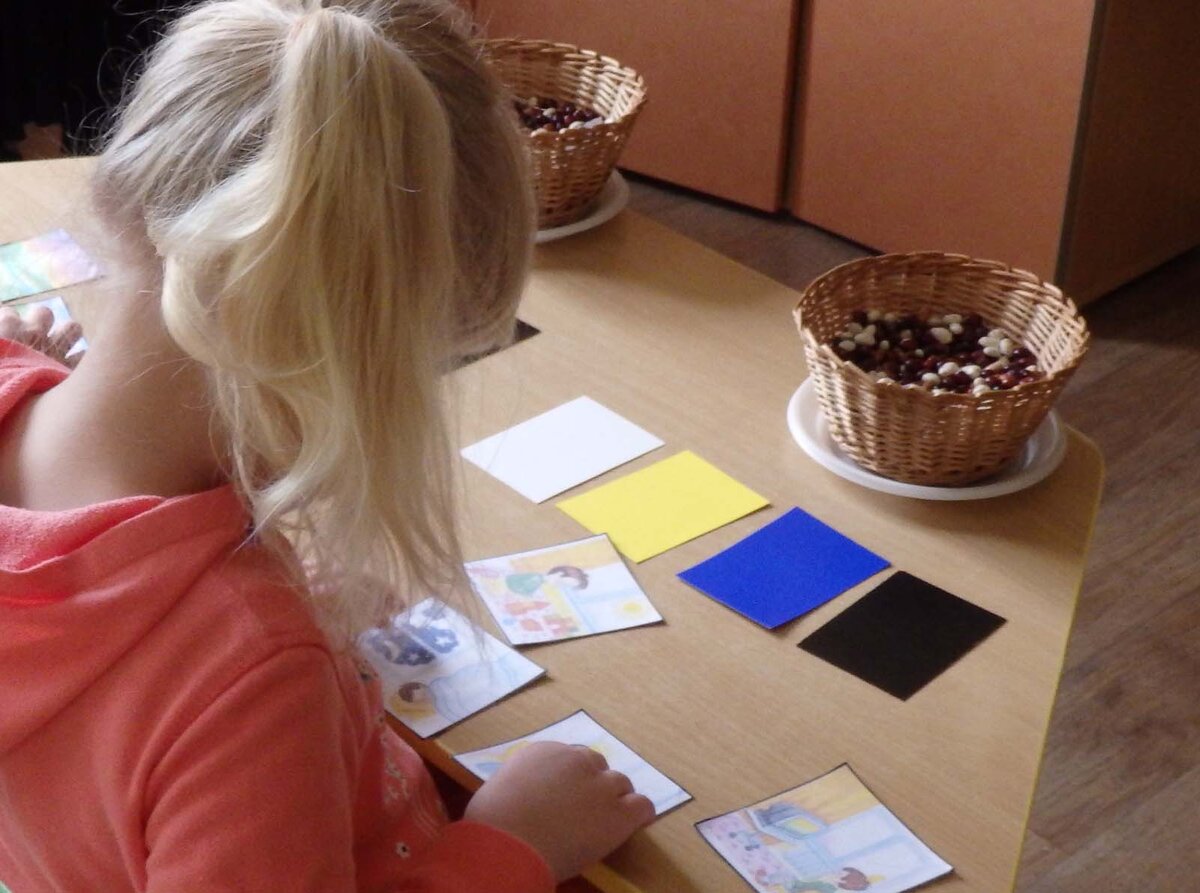 Дети выполняют задание, используя пеналы с фишками синего, красного и зелёного цвета.