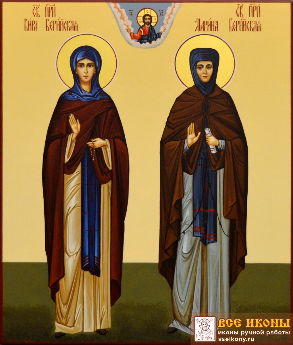 Марина и Кира были родными сестрами, которые жили в Малой Азии в IV веке. Они происходили из знатной и богатой семьи, но девушки стремились к монашеству. Достигнув совершеннолетия, обе сестры ушли из родительского дома в затвор. Они жили в пещере, где полностью посвятили себя молитве и посту. К ним позже присоединились их бывшие служанки, они тоже захотели посвятить себя Господу. Святые поселили их в отдельном домике, а сами оставались в пещере. Допускали в свое жилище девы только святителя Феодорита, епископа Кирского. Он часто просил их не брать на себя подвигов выше человеческих сил, зная, что физически Кира и Марина были достаточно слабы. Но святые прожили в пещере 40 лет, лишь дважды выйдя из неё. Первый раз это произошло, когда девы пошли в Иерусалим поклониться Гробу Господню. А второй раз Марина и Кира отправились в паломничество ко гробу первомученицы равноапостольной Феклы. Отошли ко Господу преподобные в старости, около 450 года. Память святым девам совершается 12 марта. С