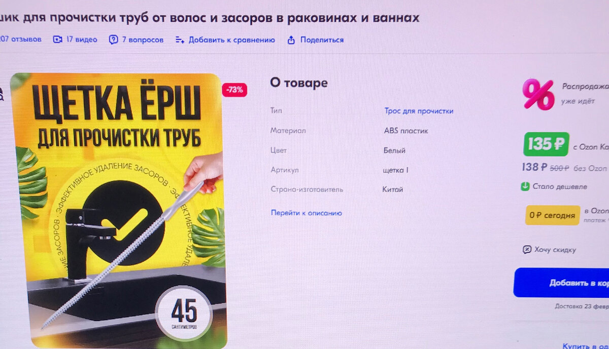 Это приспособление, которое можно приобрести на Озоне, очень нужно в хозяйстве. Щетка хорошо влезает в дырочки сливных отверстий ванны, моек. При помощи вращательных движений на щетке остаются ненужные загрязнения, которые и способствуют образованию засоров в трубах. Считаю, что минусов у щетки практически нет, одни плюсы для этой полезной в быту вещицы. Щетка-ерш доступна по цене, хорошо моется, занимает мало места при хранении.