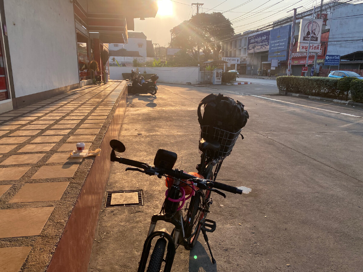 Купил кофе да пару горячих круассанов с сосисками и сыром. До города Чианг рай 175 километров. Сегодня решил проехать столько сколько проедется. Если что переночую в палатке.
