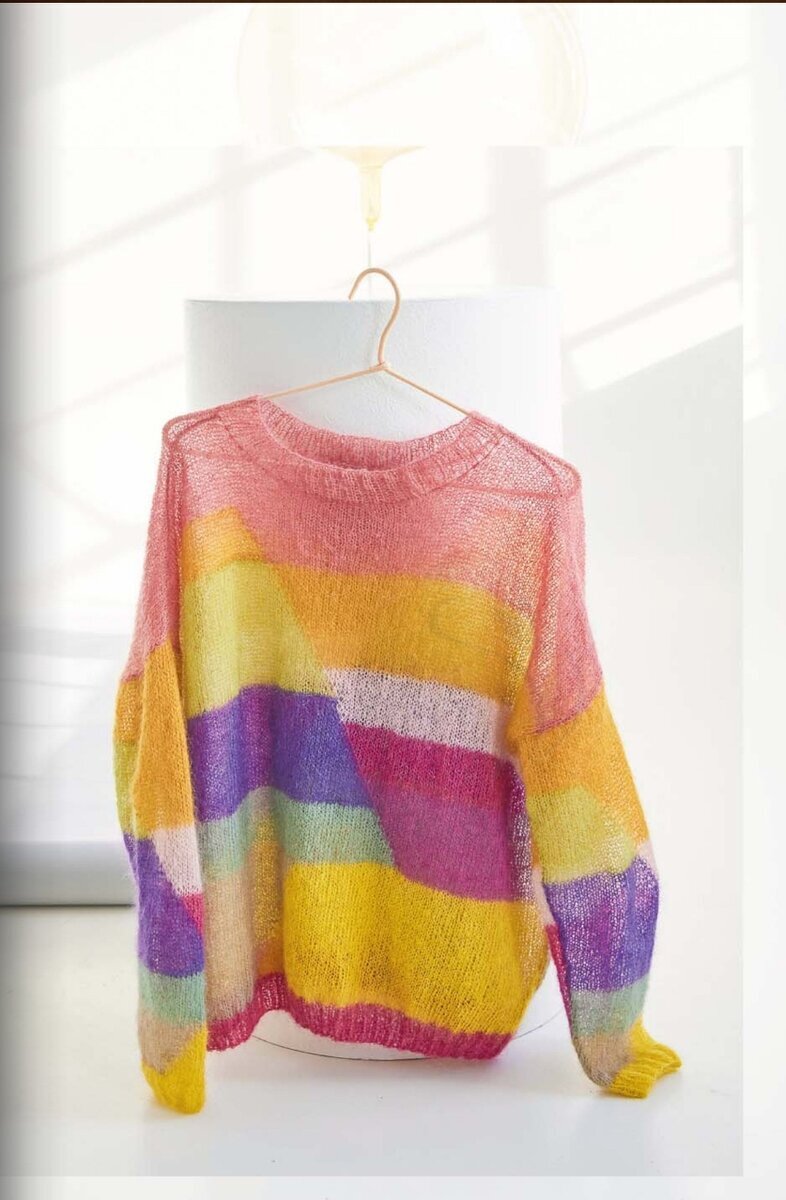 Длина изделия: 47 (52) 57 см Длина рукава: 39 (43) 46 см Вам потребуется: пряжа Hobbi Friends Kid Silk (72% мохера. 25% шелка, 3% шерсти: 25 г/200 м) - 1 моток темно-розовой (цв. 57), 1 моток серо-коричневой (цв. 07), 1 моток оранжевой (цв. 13), 1 моток горчично-желтой (цв. 28), 1 моток розовой (цв. 37), 1 моток малиновой (цв. 48). 1 моток светло-розовой (цв. 52),