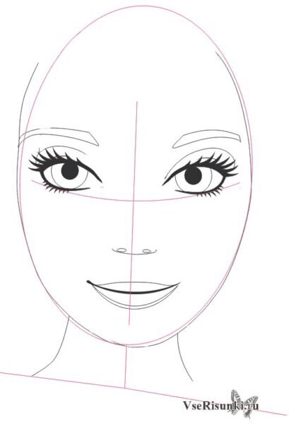 1. Начните с рисования головы Барби. Нарисуйте овал в нужных пропорциях и добавьте детали лица.