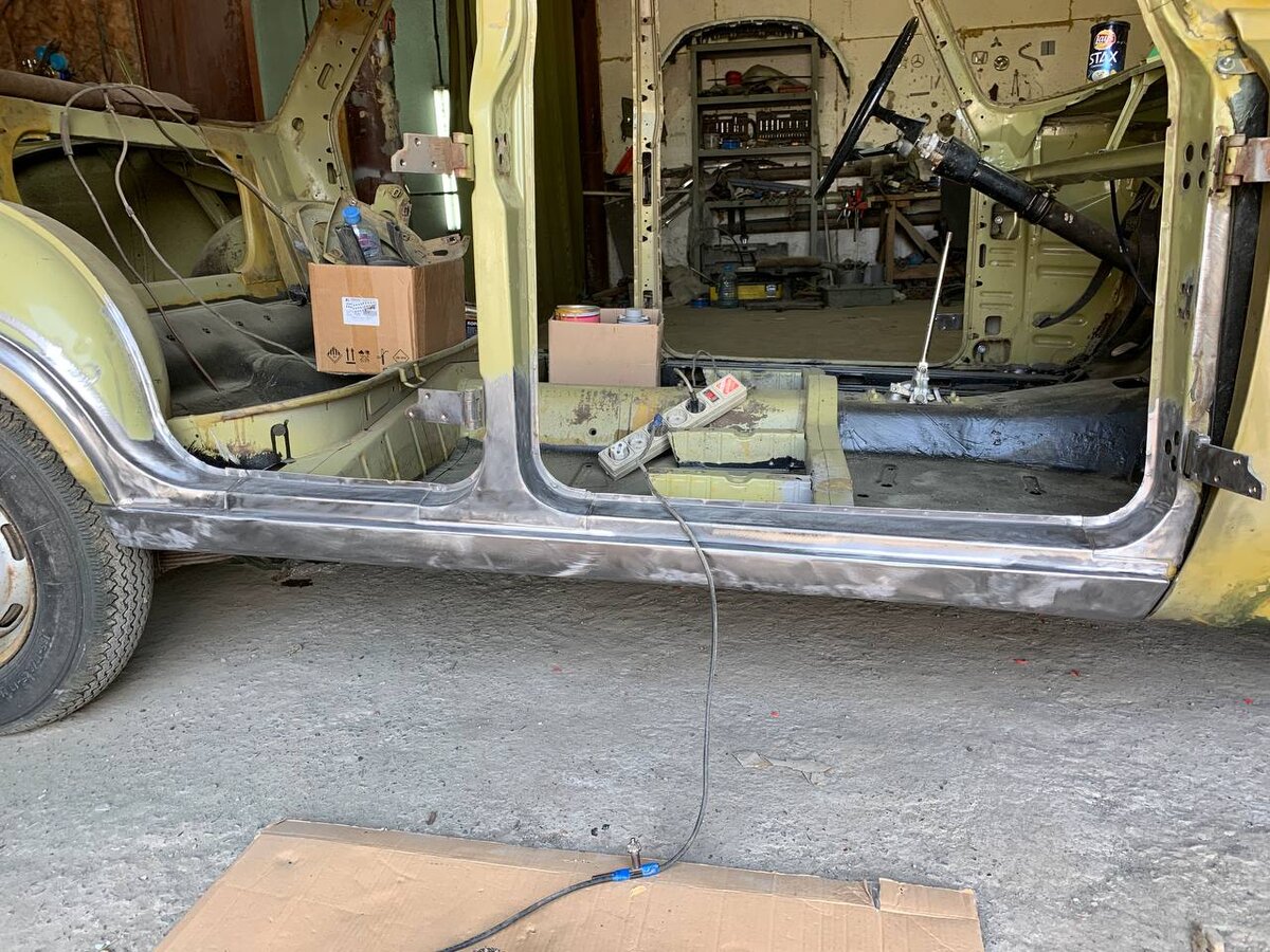После перешёл в лежачее положение, предварительно подстелив картонку, чтобы зачистить пороги😁 Частично нижние части порогов были зачищены когда машина была на боку🐒 Это очень упростило задачу👍 Все также шлифмашинкой и дрелью с щёткой зачистил пороги😬